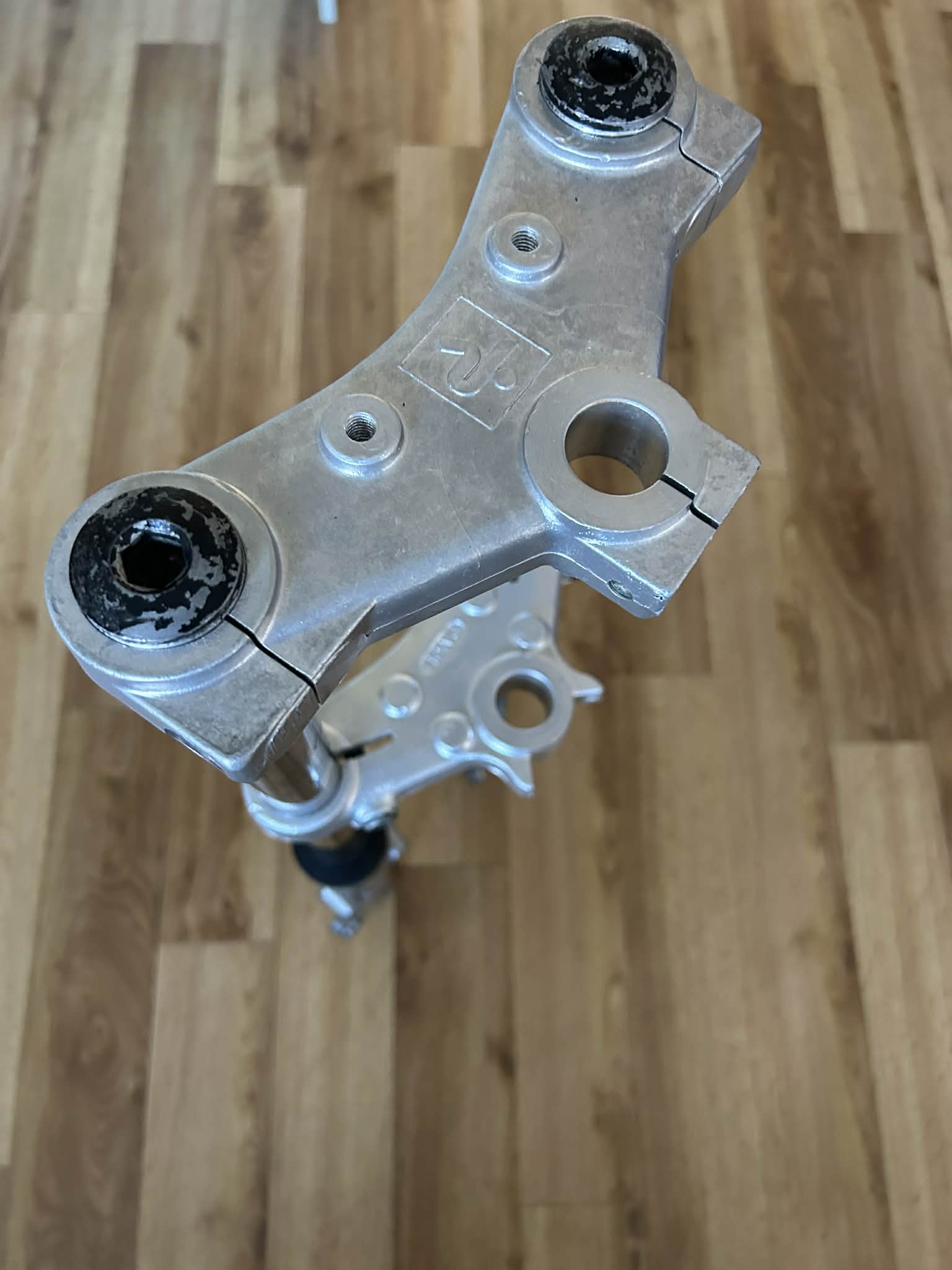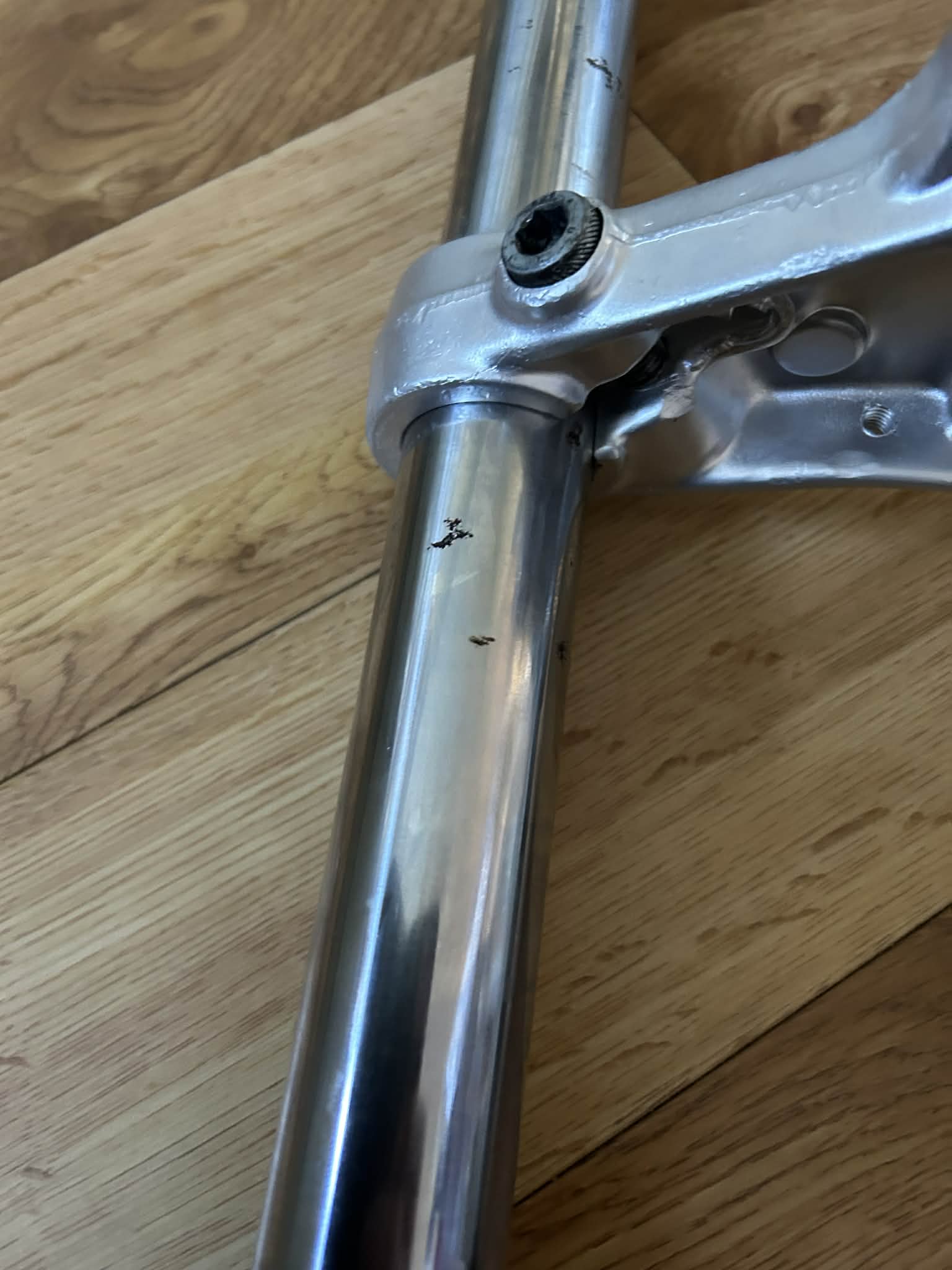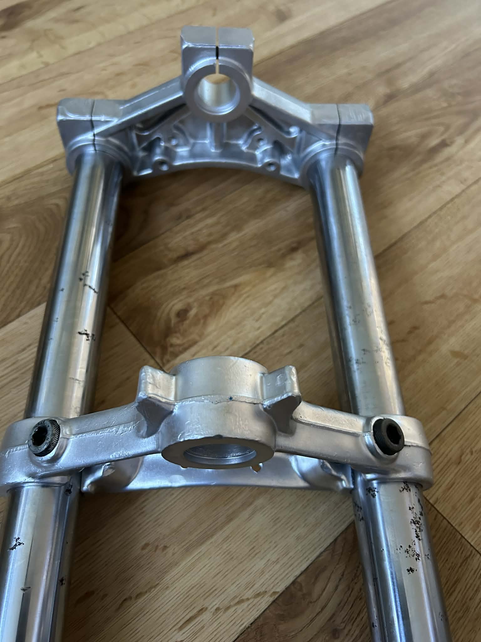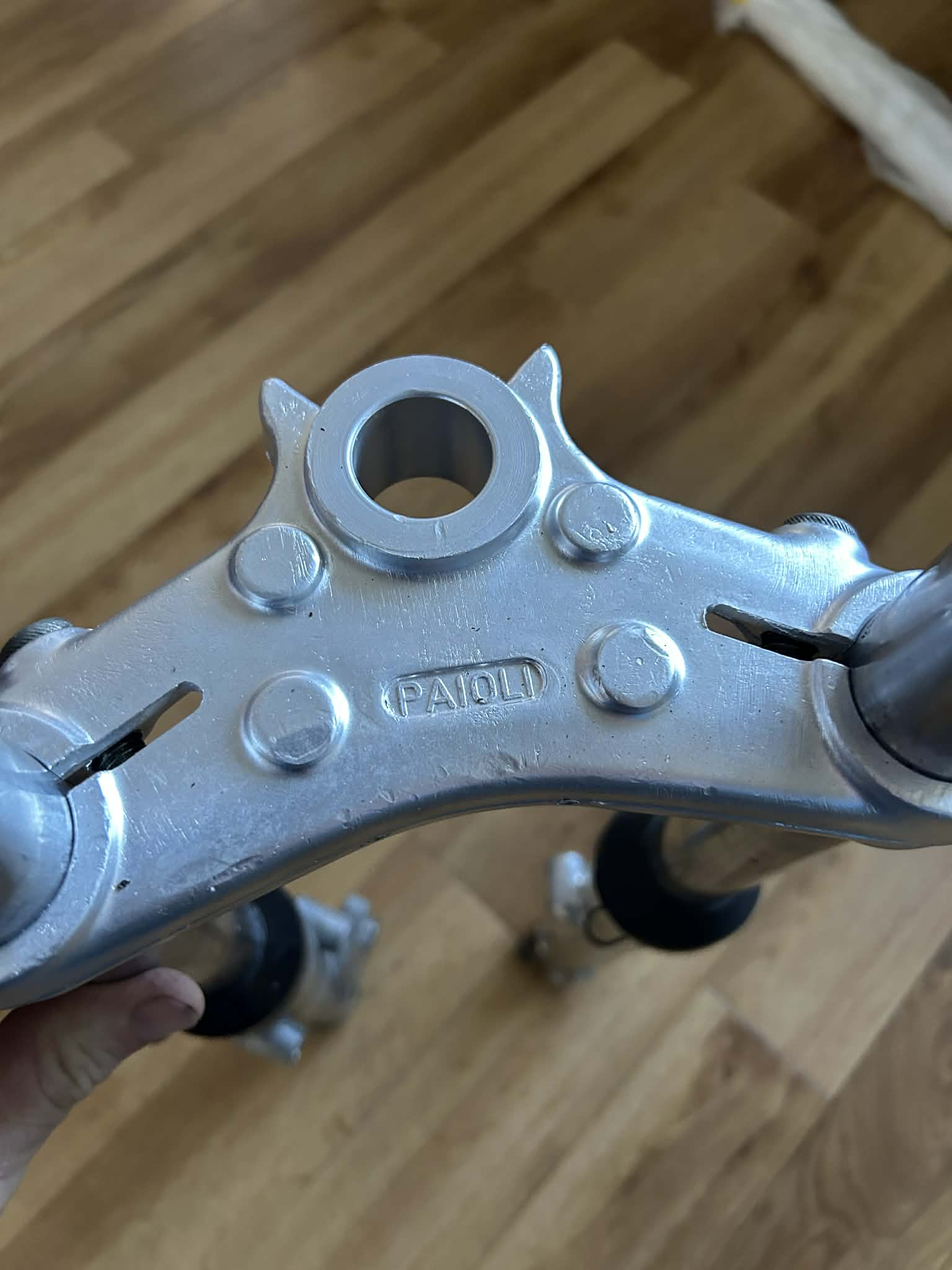 Used set of 35mm Paioli forks with alloy yokes that have been professionally vapour blasted.   There is no steering stem, it has been pressed out and is no longer with these forks.