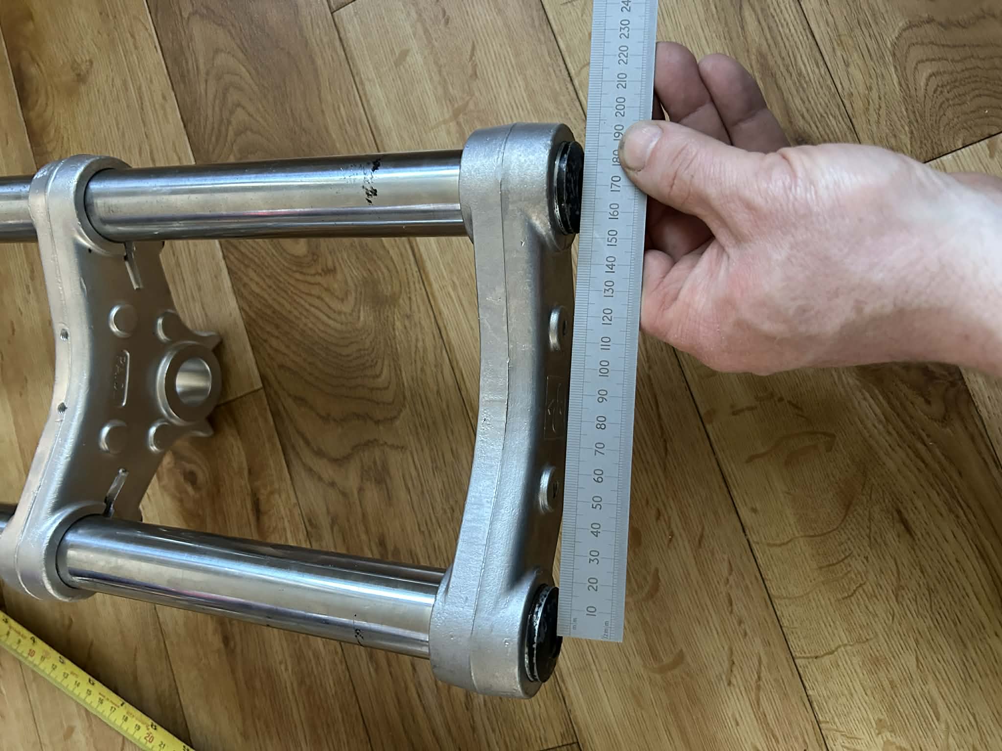 Fork legs centre to centre across the bike is approx 170mm.   The gap between the legs (where the hub assy goes) is approx 130mm.   Double disc set up and the centres of the calliper mounts is approx 93.5mm (to suit the Brembo P05 calipers?)