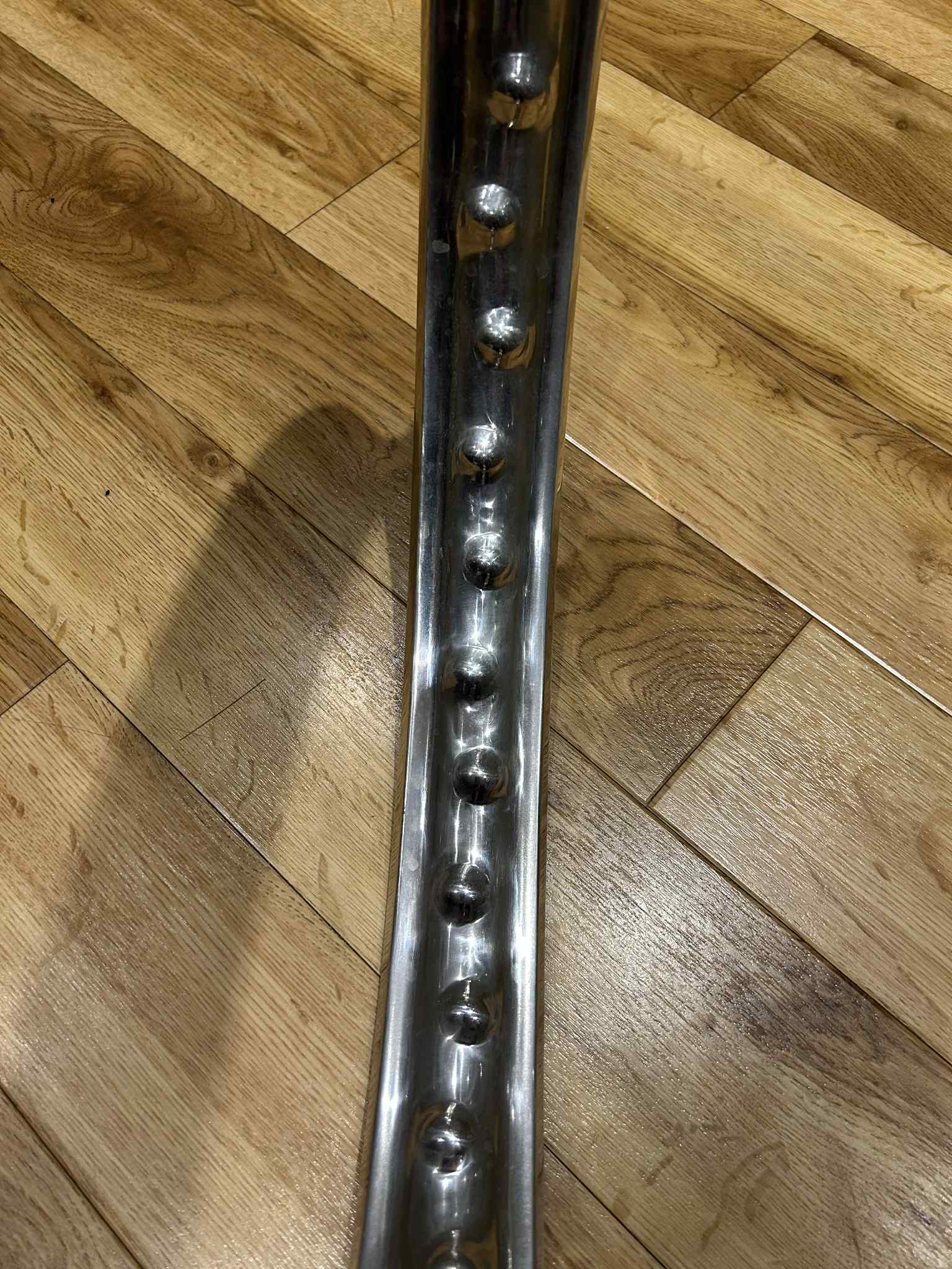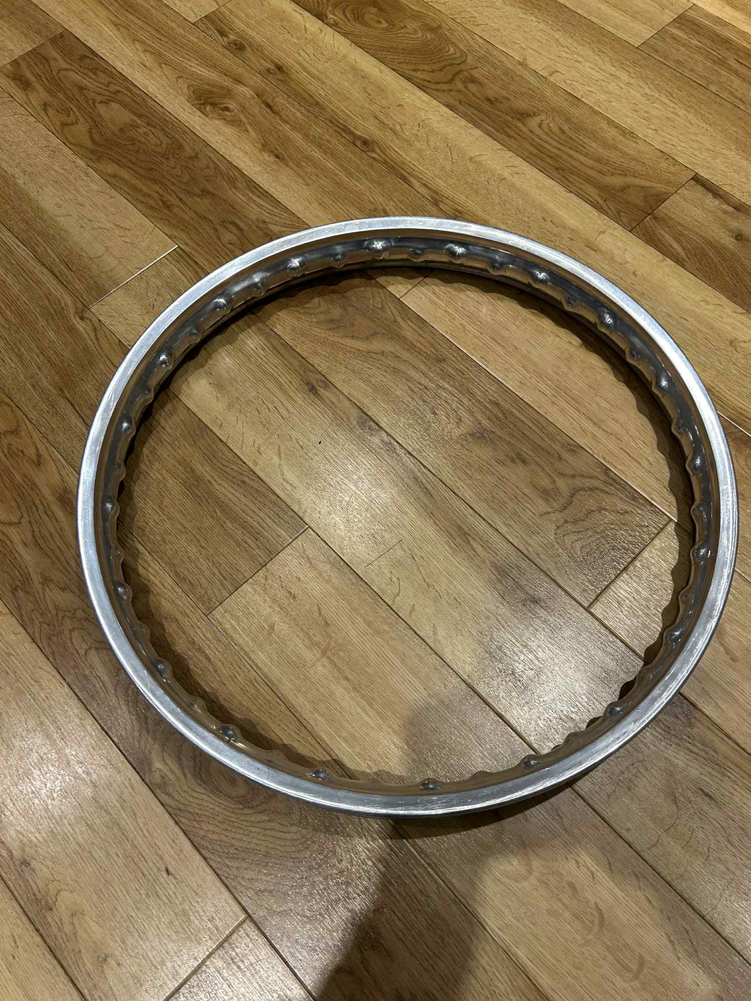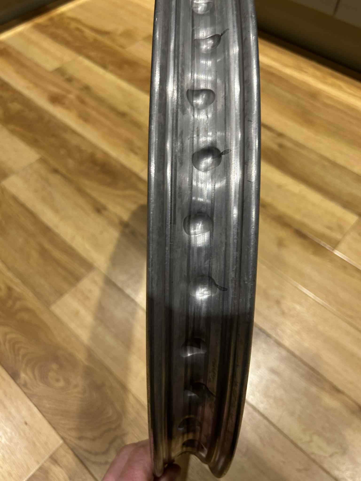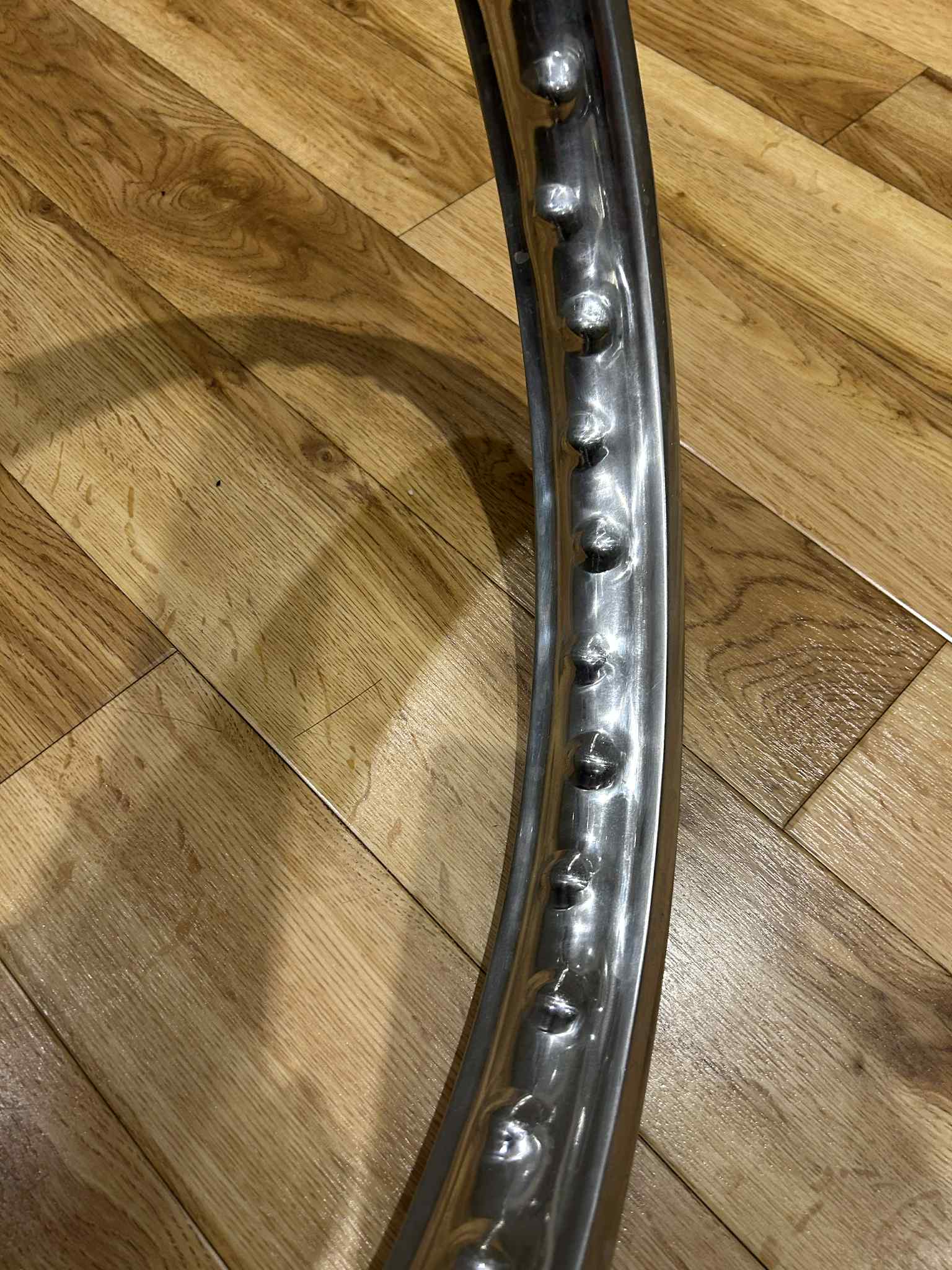Polished (but would welcome a re-polish as it has been stored for many years) Will need to be drilled to suit your hub – talk to your wheel builder.